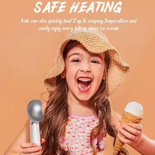 Warmth that’s smart and reassuring. Hold the handle and the internal core transfers gentle heat toward the scoop head—enough to glide, not to feel hot. All elements are sealed for a clean, kid-friendly design, and the grippy handle keeps hands secure. Kids can help with guidance: the edge warms for easier scooping but never exposes parts.
